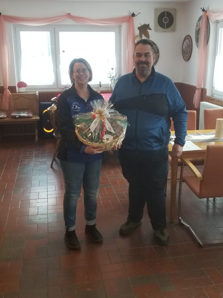 Nicole Wild bekommt von Rundenwettkampfleiter Ingo Soller einen Geschenkkorb zum 1. Platz in der Mannschaftswertung überreicht